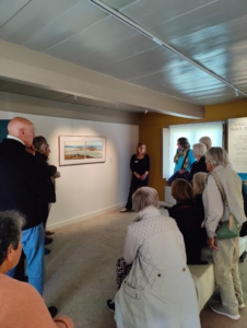 Evert Musch werd in 1918 geboren in Groningen, maar verhuisde in 1944 naar Drenthe, waar hij zijn hele verdere leven (hij overleed in 2007) bleef wonen en werken. Evert Musch is het meest bekend om zijn Drentse landschappen, maar Tessa liet ons in de de eerste kamer zien dat hij allerlei stijlen en technieken beheerste; we zagen prachtige portretten, o.a. van zijn dochter Liesbeth, als kleuter en als 11 jarige, stillevens, litho’s en etsen en prachtige Franse landschappen. Evert zei: ‘ik ben een vis, ik ben niet te vangen, ik wil niet in een hokje gestopt worden. Ik schilder vanuit mijn hart’. Tessa vertelde dat de echtgenote van Evert, To Jager, oorspronkelijk ook kunstschilder was; na de geboorte van de kinderen kwam To niet meer aan schilderen toe.