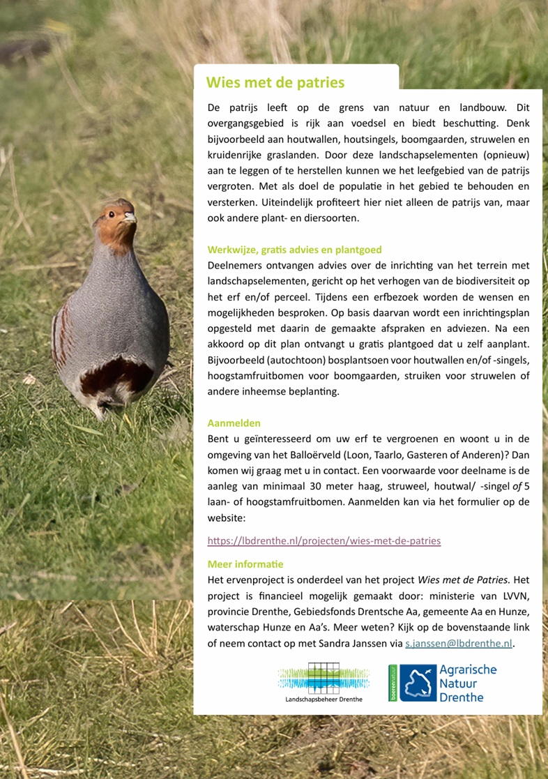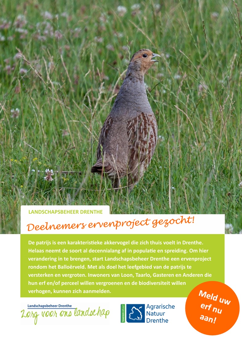 De patrijs is een karakteristieke akkervogel die zich thuis voelt in Drenthe. Helaas neemt de soort al decennialang af in populatie en spreiding. Om hier verandering in te brengen, start Landschapsbeheer Drenthe een ervenproject rondom het Balloërveld. Met als doel het leefgebied van de patrijs te versterken en vergroten. Inwoners van Loon, Taarlo, Gasteren en Anderen die hun erf en/of perceel willen vergroenen en de biodiversiteit willen verhogen, kunnen zich aanmelden.