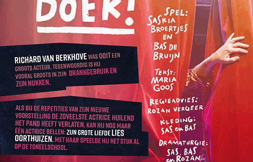 Saskia Broertjes en Bas de Bruijn (bekend van de voorstelling ‘Lang leve de Familie’, eerder vertoond in de Gasterije) spelen op 24 oktober de voorstelling ‘DOEK!’ in de huiskamer van de Gasterije.