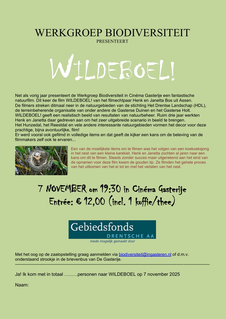 Wildeboel!14 oktober 2025 N.B.! Met het oog op de zaalopstelling graag aanmelden via biodiversiteit@ingasteren.nl Nieuws verspreiden: Klik om dit te e-mailen naar een vriend (Wordt in een nieuw venster geopend) E-mail Klik om af te drukken (Wordt in een nieuw venster geopend) Print Klik om te delen op WhatsApp (Wordt in een nieuw venster geopend) WhatsApp Klik om te delen op X (Wordt in een nieuw venster geopend) X https://ingasteren.nl/wp-content/uploads/2025/09/Aankondiging.jpg 2549 1786 Peter https://ingasteren.nl/wp-content/uploads/2017/03/InGasterenPuntNL-090327-C.png Peter2025-10-14 13:30:382025-10-16 21:07:14Wildeboel!