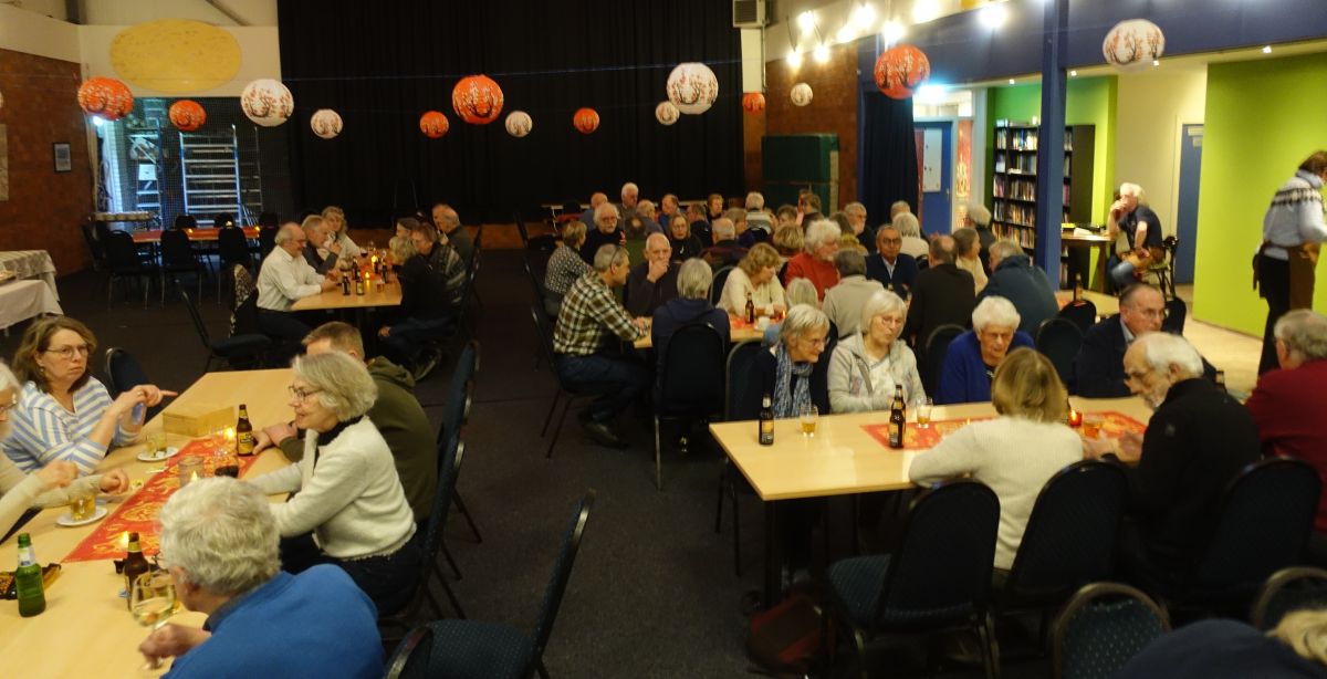 举几个例子(并非全部):烤猪肉、冬阴功、咕噜肉、大排档、仁当牛肉,当然还有罗汉坡。当然,这些菜肴也有素食版本。虾片?当然有。迷你春卷、沙爹鸡?绝对有!还有甜点?当然有!和维也纳甜点很像。尽情享用吧!之后——以及一番社交之后——一百一十位参与者兴高采烈地离开了德加斯特里耶。Voor de lezers die de Chinese taal niet machtig zijn klik hier voor de vertaling.